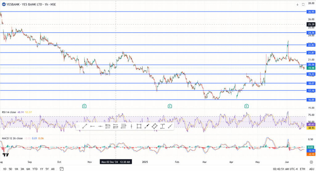 Yes Bank (NSE: YESBANK) may have gotten a credit rating upgrade from Moody’s, but the share price hasn’t quite followed through. At the time of writing, the stock is trading near ₹19.98, stuck just below a stubborn resistance zone around ₹20.36. It’s a familiar pattern: good news on paper, but the chart still says “wait.”